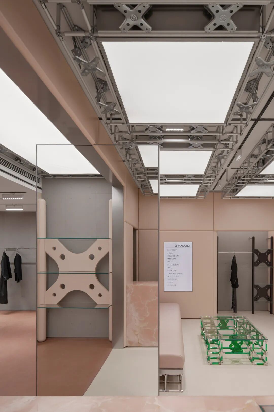 这是一次小空间买手店的新尝试,也是低矮空间的实验设计。 场地原本是百货商场,整体层高有限,因此,我们采用不同的天花高度为功能分区,保持通透的空间关系。整个空间划分为内外区域,分别是前区(对外展示区)和后区(对内服务区)。