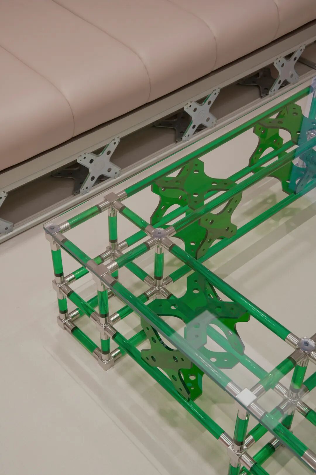Just as the process of industrial construction involves evolution and change, fashion is also a construct that evolves over time. The butterfly-shaped frame, a conventional component in stage construction, is a symbol that showcases contradictory characteristics of variability and stability, with the butterfly's shape itself serving as a metaphor for change.