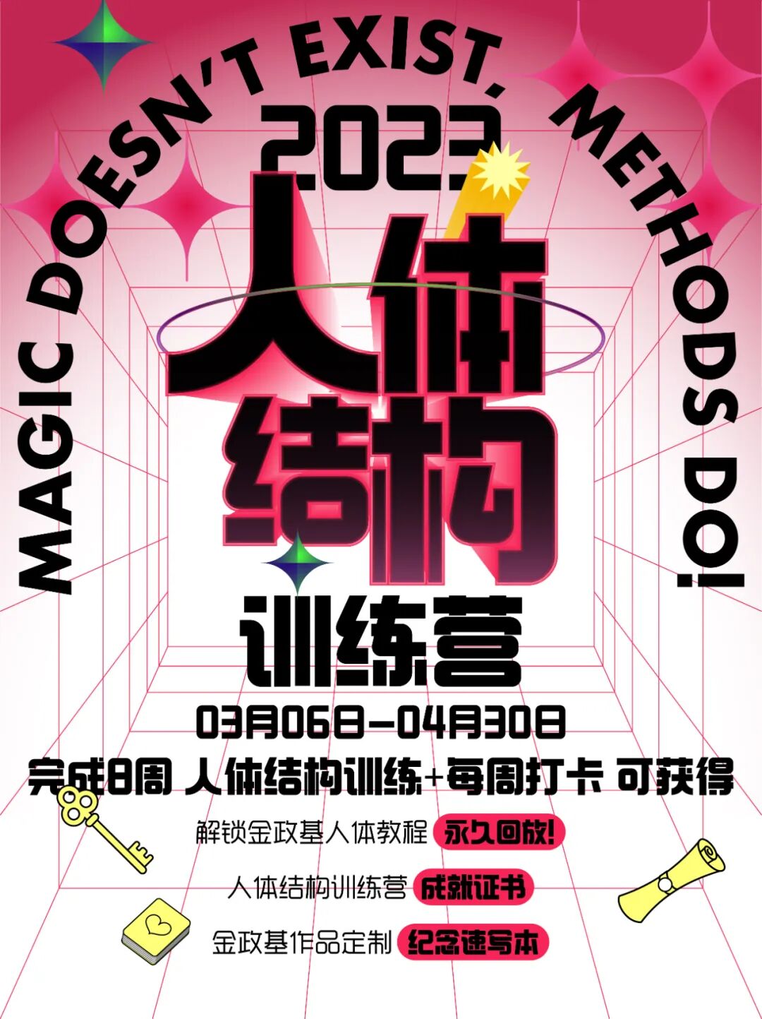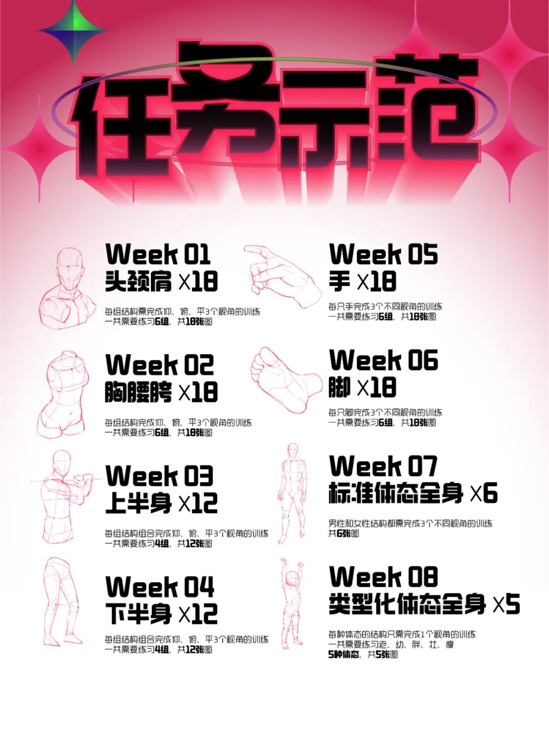 《人体结构训练营》是根据金政基老师的课程作业细化拆分而来的。旨在通过刻意有效的训练,实现绘画能力的逐步提高!训练营由训练任务、针对性课程、一对一辅导、直播讲解、打卡奖励构成。核心理念是以训练带学习!以实战带理论!完成训练任务成功获得:永久回看权益+训练营证书+金政基作品定制速写本