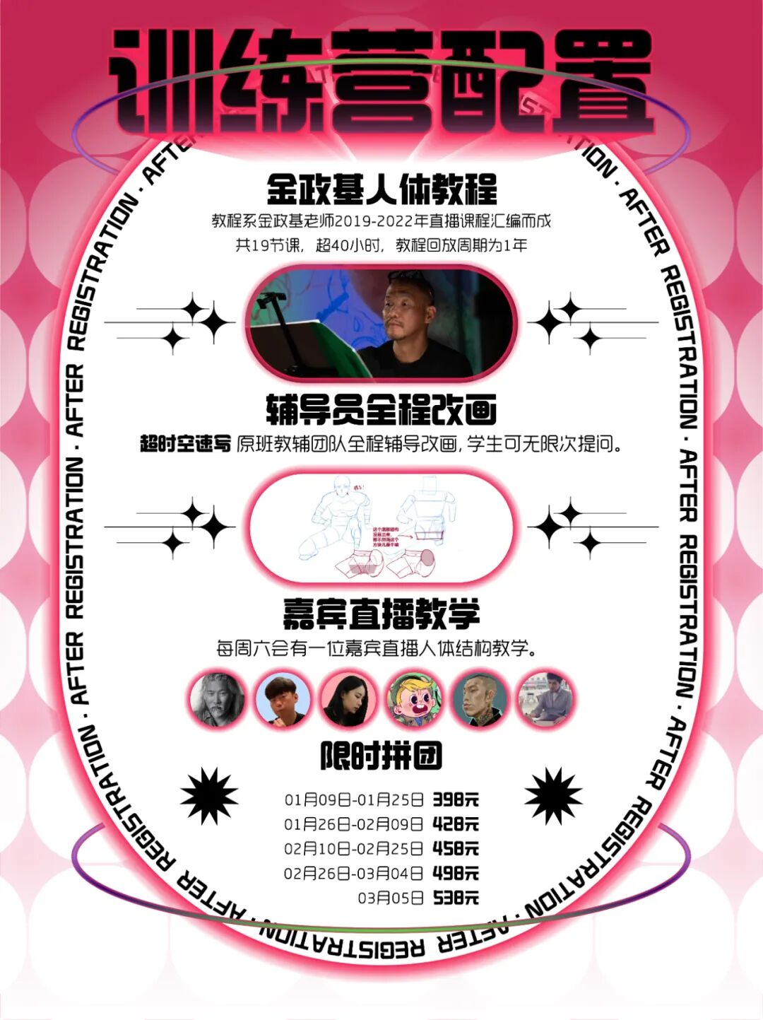本期【人体结构】训练营于3月6日开课,教程系金政基老师2019-2022年直播课程汇编而成,共19节课,超40课时,教程回放周期为1年,课程期间学生可无限次提问。