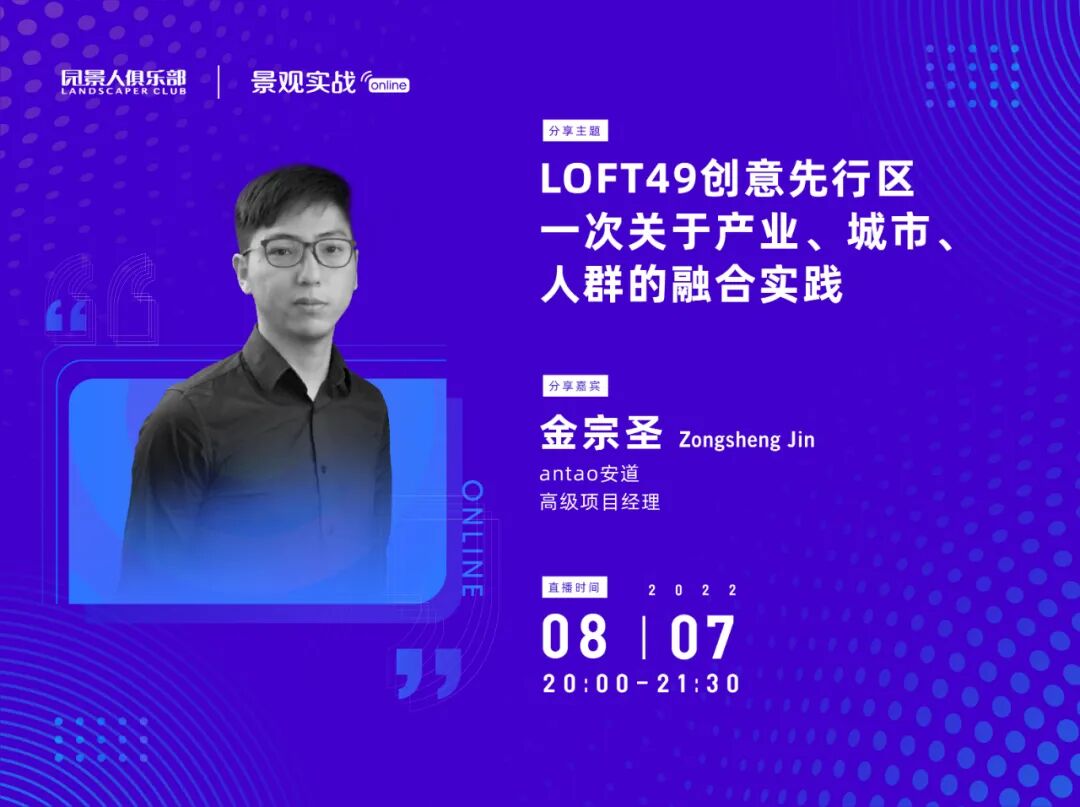 8月7日(周日)晚上20:00,antao安道高级项目经理金宗圣先生为大家带来景观实战online58讲分享,《LOFT49创意先行区 —— 一次关于产业、城市、人群的融合实践 》!带大家一起探索如何在公共空间里激活场地的无限可能。首播免费,回看付费39.9元!(俱乐部会员免费回看)