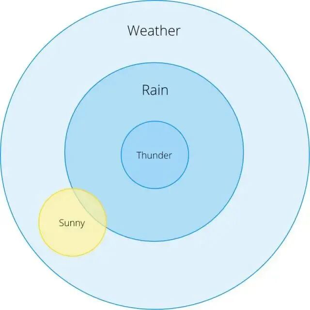 从这个欧拉图,我们可以看到 P(Rain | Thunder)= 1 :当我们看到雷声时,总会下雨(当然,这不完全正确,但是我们在这个例子中保证它成立)。
