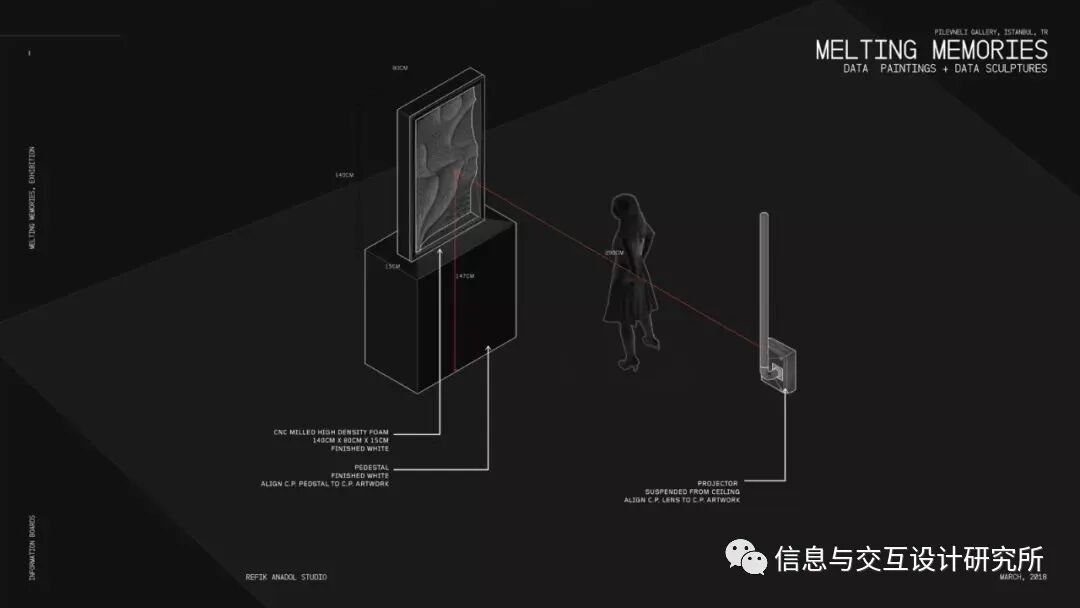 Melting Memories结合数位绘画、光线投影跟扩增数据雕塑的视觉化作品,具体重现脑内回忆的运作机制。以客制化16 x 20 英尺(约4.9 x 6.1 公尺)的LED 媒体墙,加上CNC 泡棉所制成,灰色的漩涡在萤幕上滚动,看起来就像是翻腾的海浪、盛开的花朵或是陷落的流沙。站在这个装置前,观众可以感受大脑内部运动的艺术化诠释。