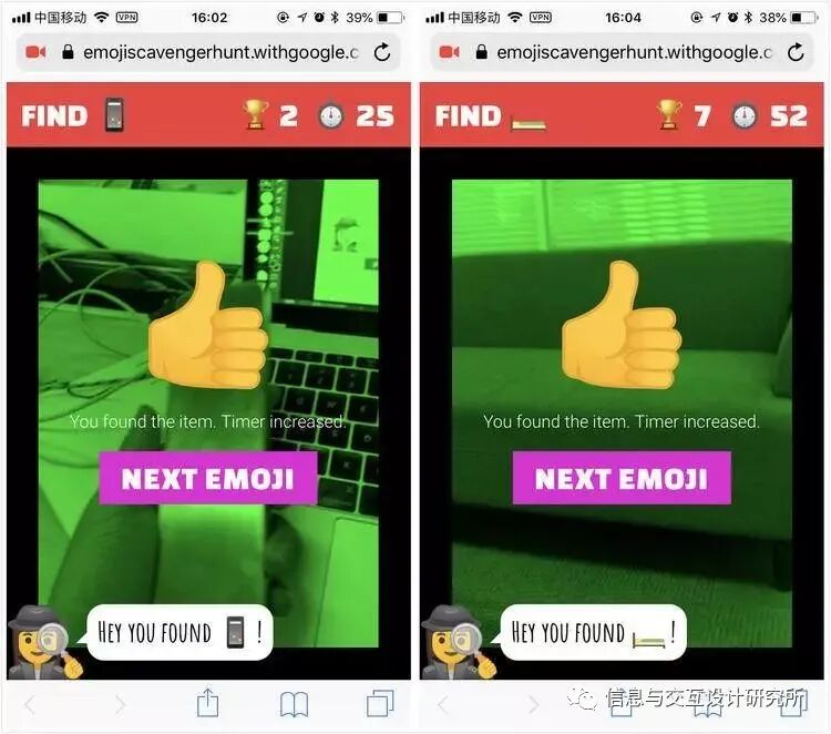 游戏会给出三秒倒计时,随后手机上会展示一个 emoji 表情,用户通过手机摄像头在周围环境中拍摄真实的物体,在这个过程中,Emoji Scavenger Hunt会不停识别看到的物体,直到找到emoji 对应的物体为止。如果识别成功,可以点击下一个 emoji 继续挑战。当你在现实世界中发现表情符号时,随后的表情符号显示难度增加。从你可能拥有的物品开始,比如鞋子,书本或者你自己的手,一直到踏板车这样的物品。有趣的是,当你用手机扫过其它不正确的物体时,左下角还有个 emoji 小人跟你实时互动,告诉你摄像头里看到的是什么东西。在游戏结束后,你可以将自己的战绩分享到社交平台。