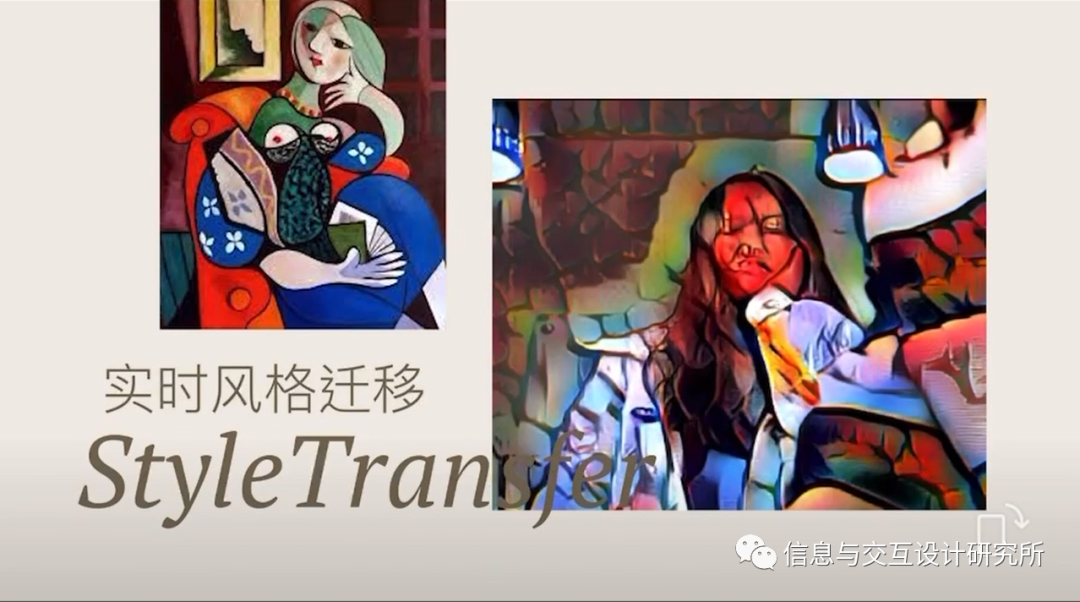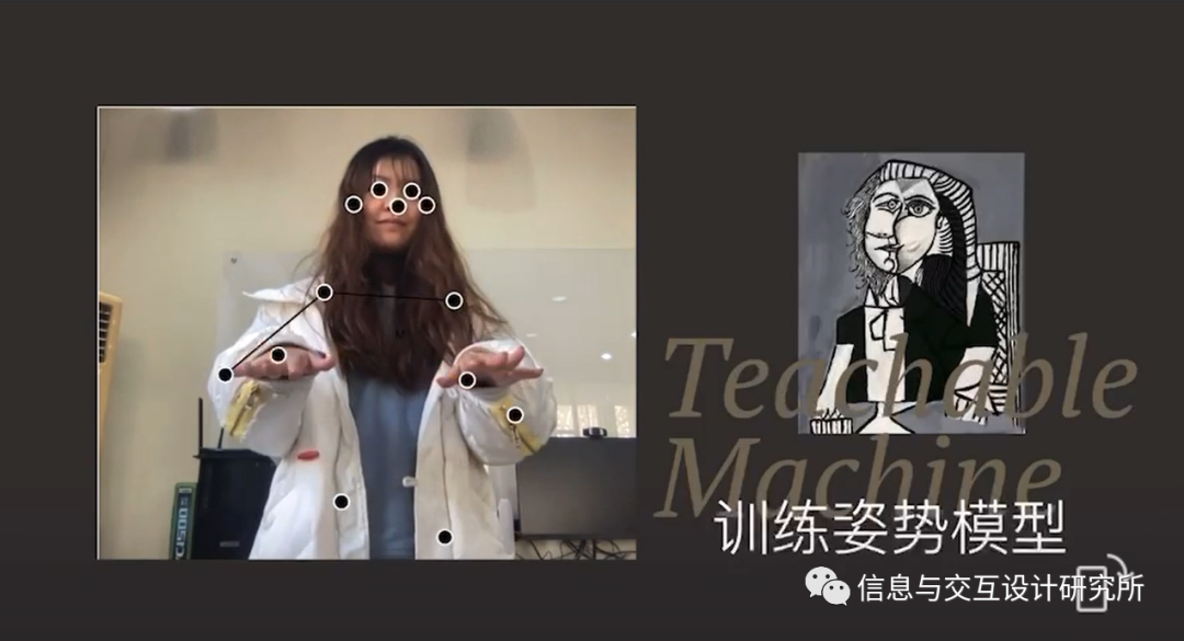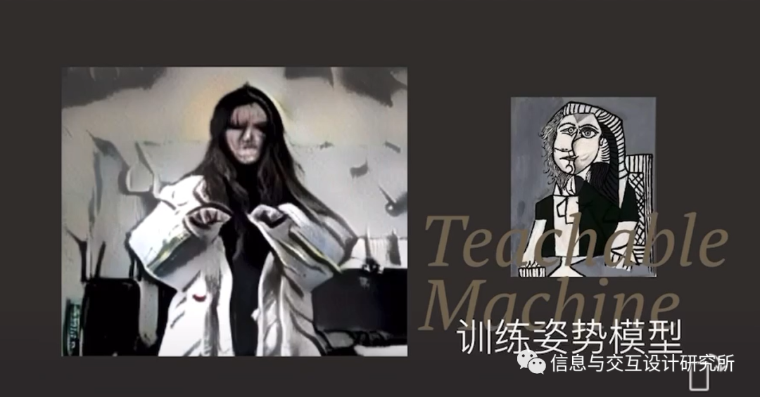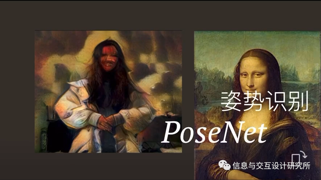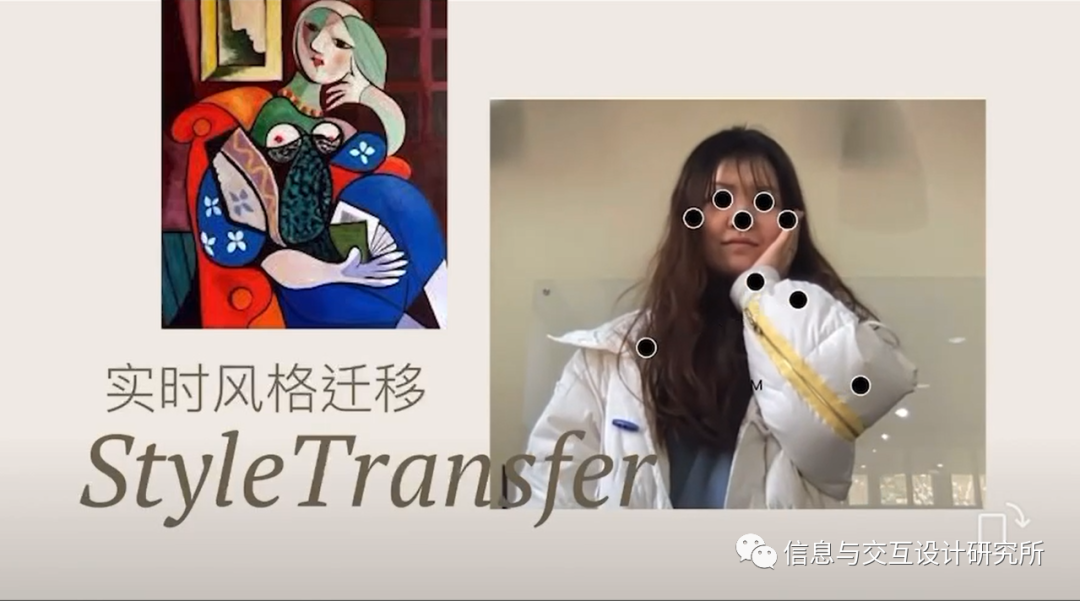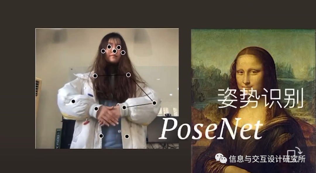 该项目首先用机器学习对3幅名画中人物的姿势进行训练贴标签,再采用 ML5.js 中的 PoseNet 实现识别人体骨骼关节,与3幅名画中人物的姿势进行匹配,选取姿势最相似的一幅名画进行实时风格迁移。