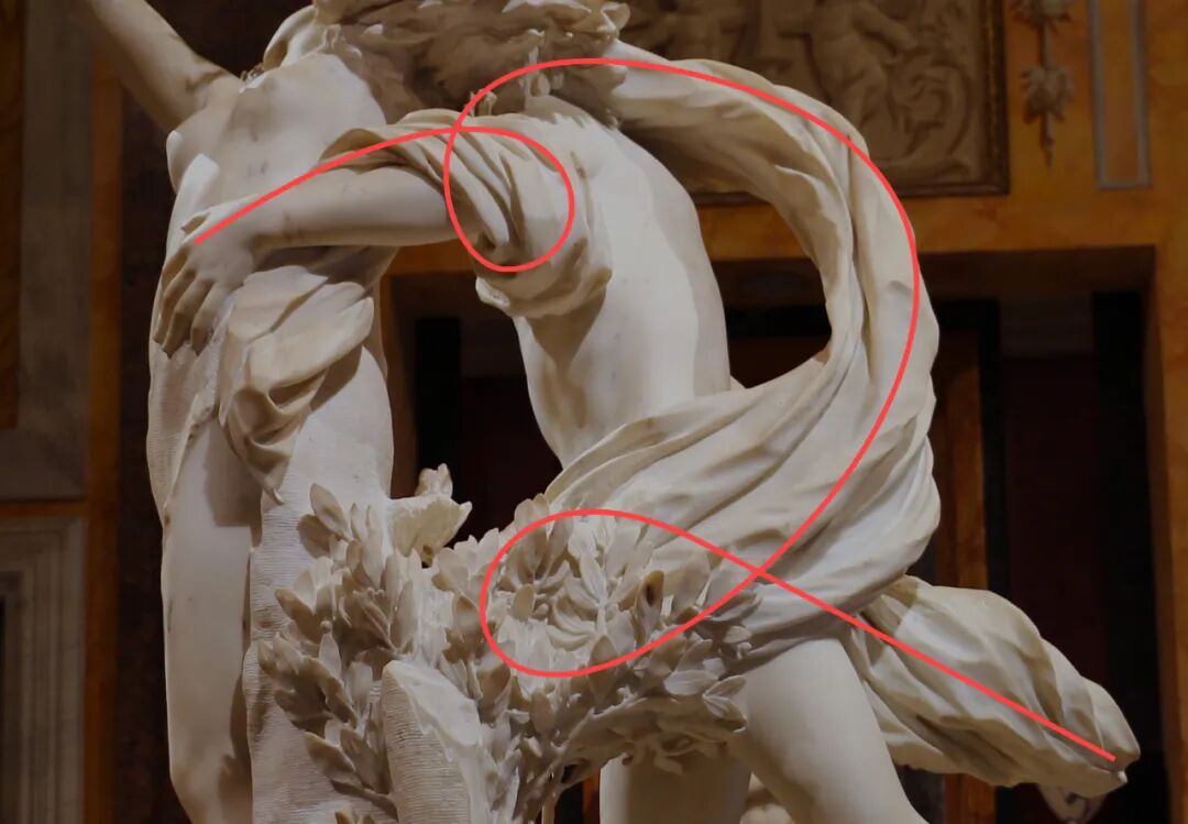 再从视觉引导的角度来观察阿波罗的长袍,长袍自阿波罗的身后起,围绕着阿波罗的腰间,经由后背绕至左臂,最终引导我们的视线到达阿波罗与达芙妮相触的位置!