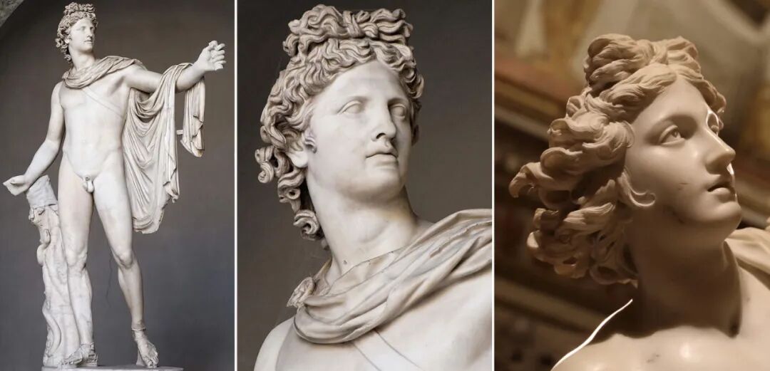 左、中:莱奥卡雷斯《贝尔维德的阿波罗》,右:贝尼尼《阿波罗与达芙妮》局部,注意阿波罗头顶的的标志性发团