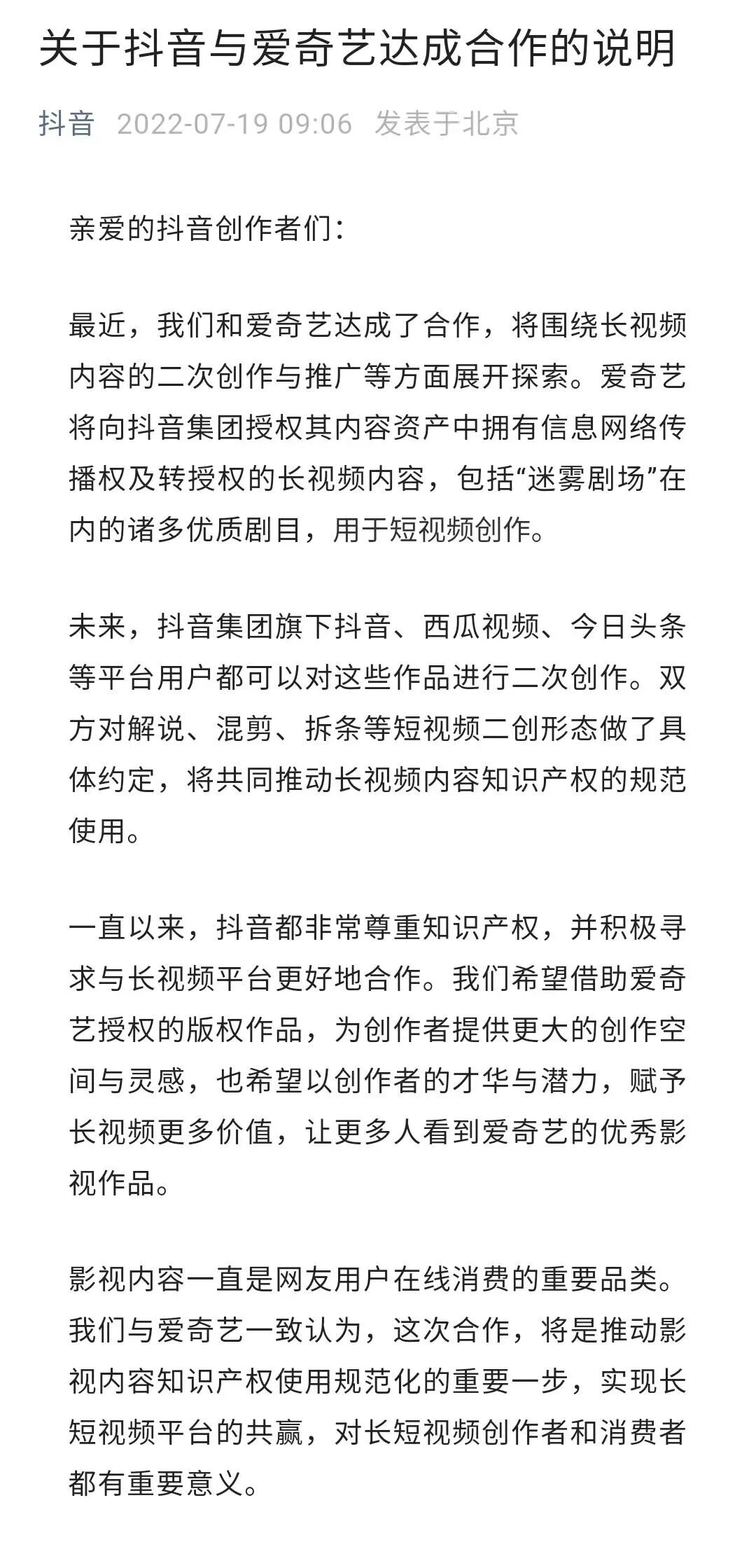 最新文章2023-07-27 继搜狐视频后,抖音与爱奇艺达成合作,涉及内容二次创作与推广 后台回复「加群」加入现代广告圈 7月19日,爱奇艺和抖音宣布达成合作,将围绕长视频内容的二次创作与推广等方面展开探索。 依据合作,爱奇艺将向抖音集团授权其内容资产中拥有信息网络传播权及转授权的长视频内容,用于短视频创作。双方对解说、混剪、拆条等短视频二创形态做了具体约定,将共同推动长视频内容知识产权的规范使用。 爱奇艺创始人、CEO龚宇表示,这是双方在尊重和保护知识产权、探索合作双赢上迈出的重要一步,具有里程碑意义。这也充分证明,爱奇艺持续创作优质长视频内容、坚持长期主义的价值,得到市场和用户的认可。相信这次合作有助于优化网络视频行业生态,拓宽合作渠道,创造更多价值,实现平台、创作者和用户的多方共赢。 抖音集团CEO张楠表示,影视创作者是抖音内容生态的重要组成部分,影视行业是抖音重要的合作伙伴。一直以来抖音都非常尊重知识产权,并积极寻求与长视频平台更好地合作。相信这次合作是一个全新的开端,双方将携手探索,为行业提供更好的解决方案,实现创作者、版权方、用户的共赢。 影视内容一直是网络用户在线消费的重要品类。双方一致认为,此次合作是长短视频平台携手探索影视内容知识产权使用规范化,实现双赢的重要一步,对于长短视频创作者和消费者均有重要意义。 END 本文来自微信公众号“现代广告杂志社”(ID:maadwx)。大作社经授权转载,该文观点仅代表作者本人,大作社平台仅提供信息存储空间服务。 TAGS: 内容合作视频重要长 相关文章英赫日报 | 李宁 × 空…米兰时装周的异星来客,用结…米兰“MoLo”移动与物流…西班牙艺术家 Juan d…把小鸟画成美少女,她弃医从…这些鸡蛋包装不只是有趣,设…国产文具又炸了!晨光再造“…七点资讯 |《更衣人偶坠入…AlphaDraw筑绘通「…秦始皇的黑,是你不懂的黑。