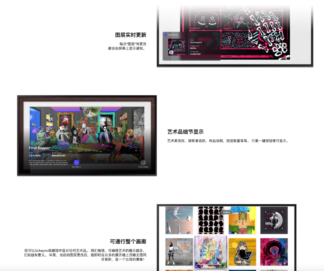 A:前期介绍的无代码 NFT 创作平台 Async Art 就拥有多种藏品展览形式,包括苹果电脑、web等移动端、实体相框等展览。