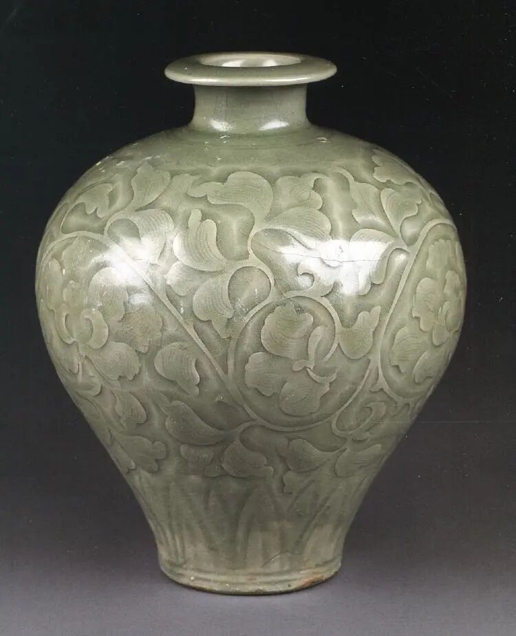 北宋耀州窑青釉刻花缠枝牡丹纹矮梅瓶