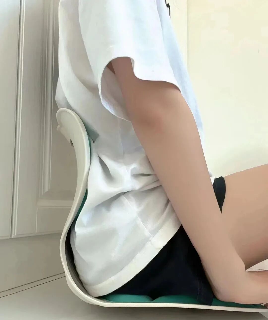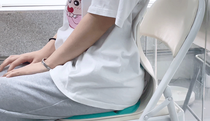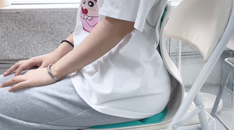 普通腰靠和坐垫,对坐姿毫无改变,坐上去依旧驼背含胸低头,大肚腩都坐出来了!