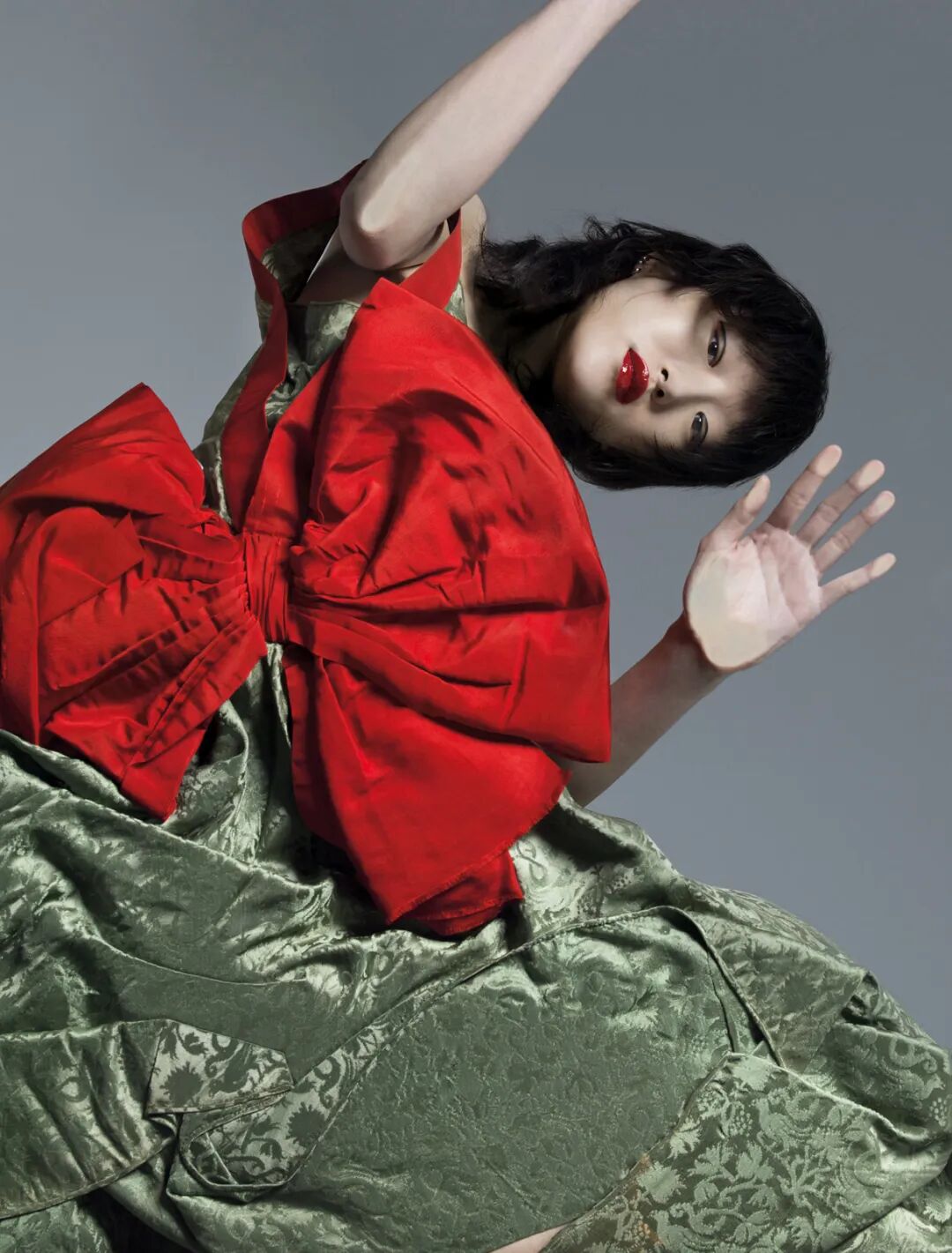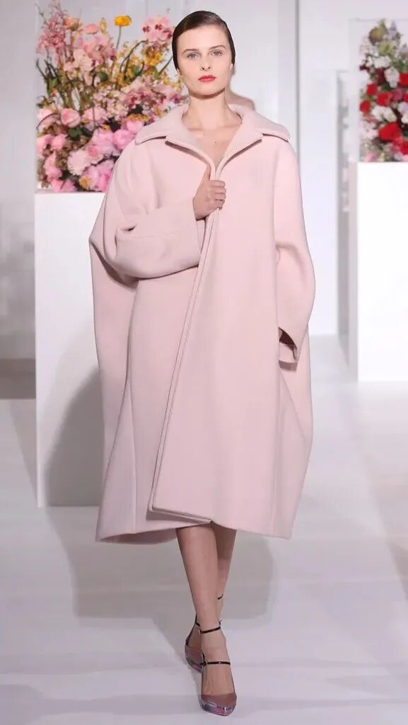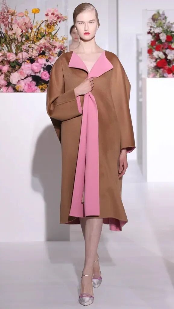 这个手势极具女性特质——它似乎带有恐惧,又似乎很舒服。展露清凉的锁骨下,它将外套的廓形重新演绎,用这个手势将视觉放在上身的正中间,但是是拒绝被男性凝视的态度
