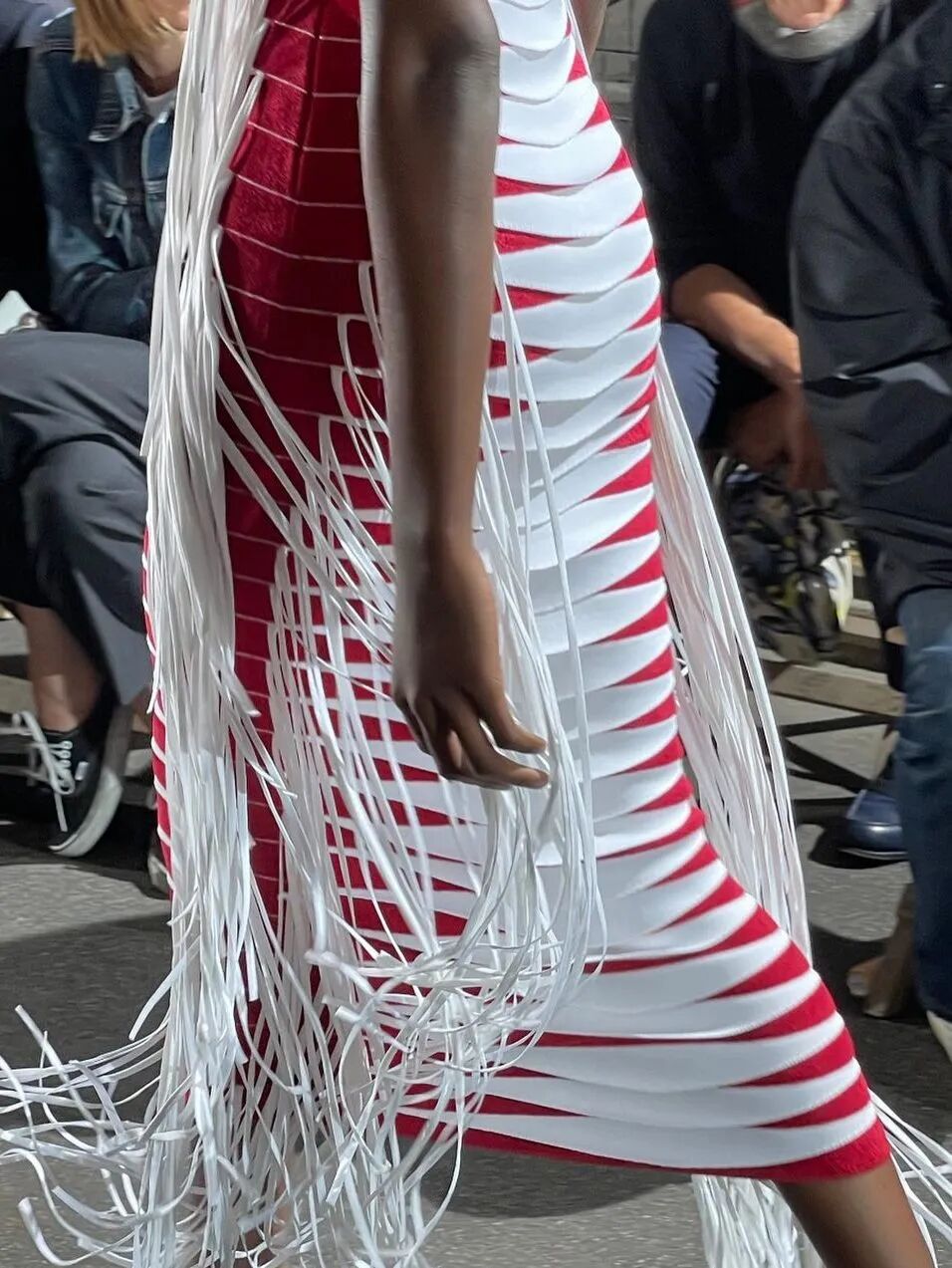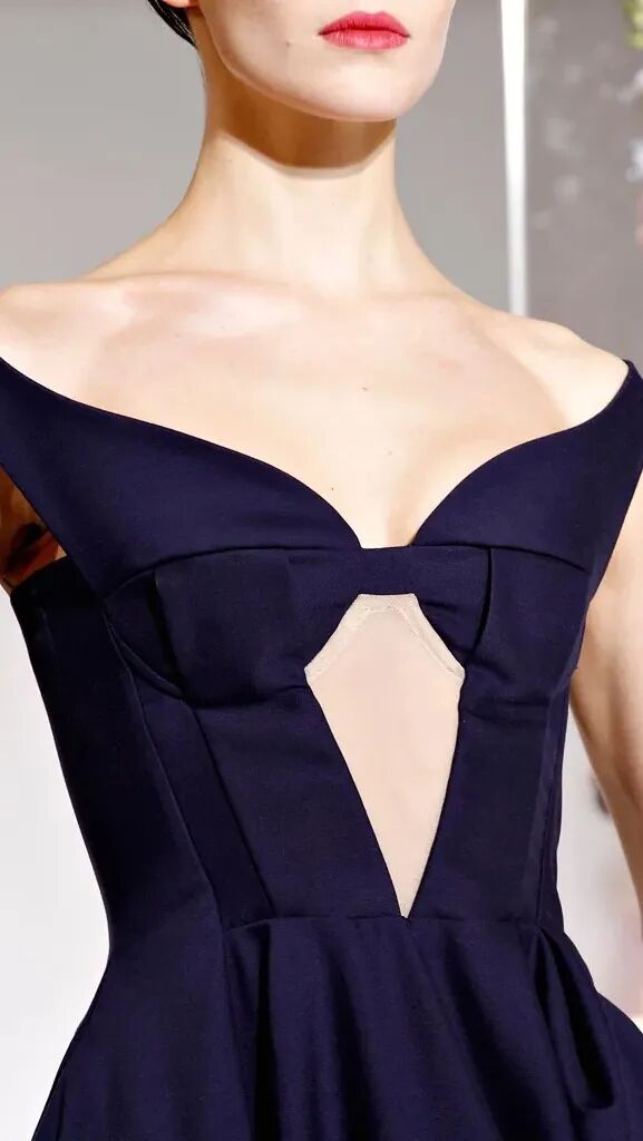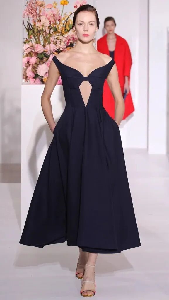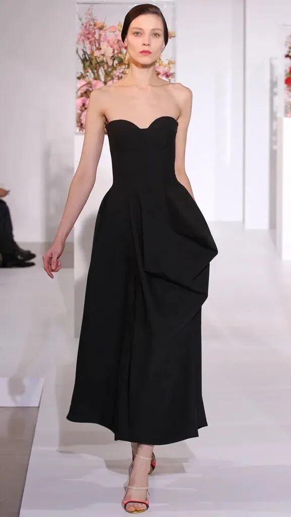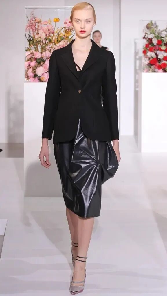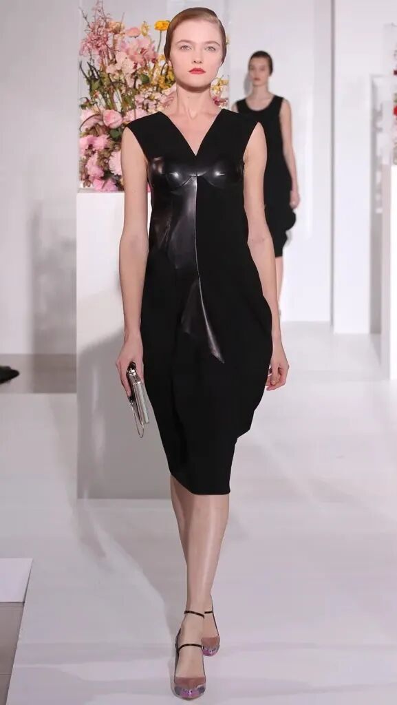 这一季出现了好几条黑色裙子,但Azza强调是30年代风潮的小黑裙。我参考了下久远的图片档案,锁定了上面有肩带的这条。其胸部到肚脐是裸色拼贴,并非裸露。当然这个系列里其他几条抹胸的黑色裙子也非常精彩!尤其是PVC和皮革面料的那一条,就很Raf。