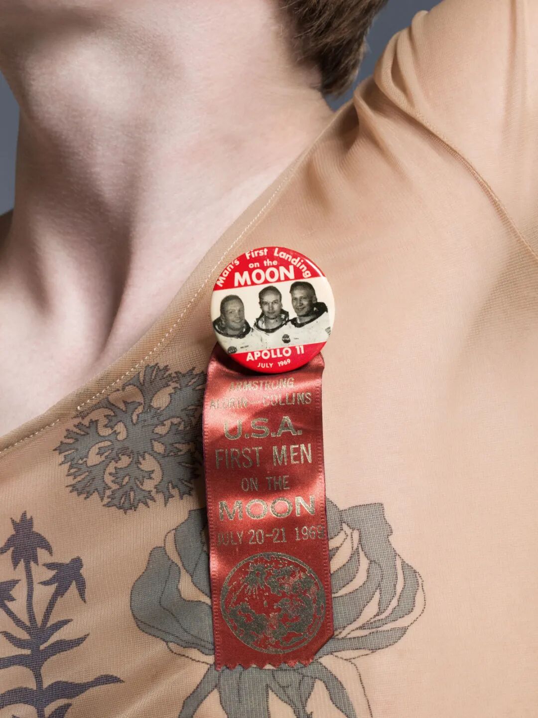 1990年Helmut Lang的纹身衣。这个不用注解,实在是太有名,亚洲第一时尚Icon王菲也在第一时间穿过。搭配的是1969年纪念阿波罗11号“人类最先踏足月球的人”胸针。