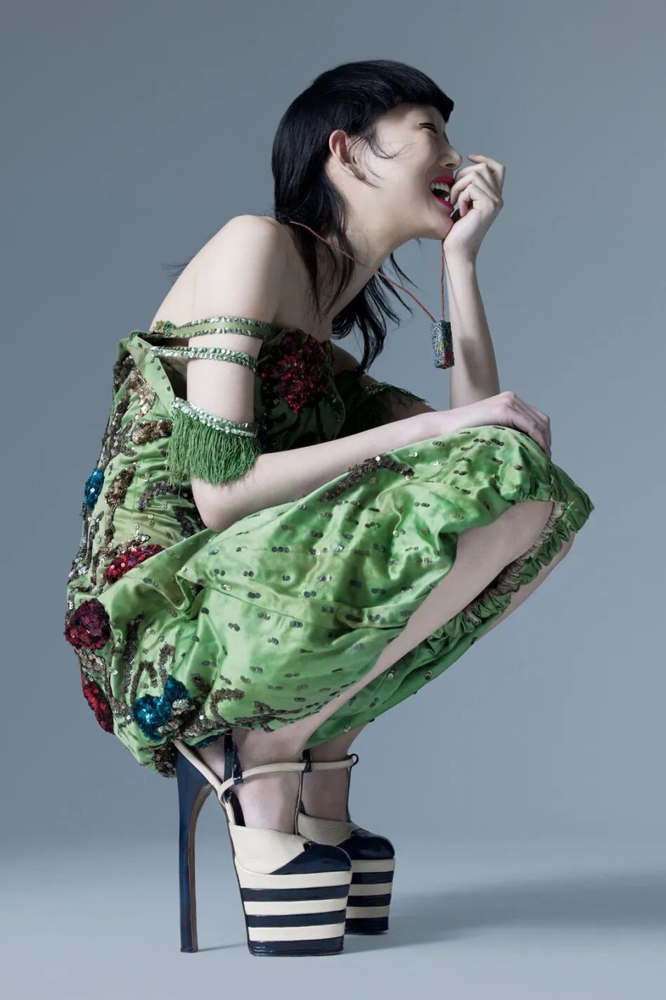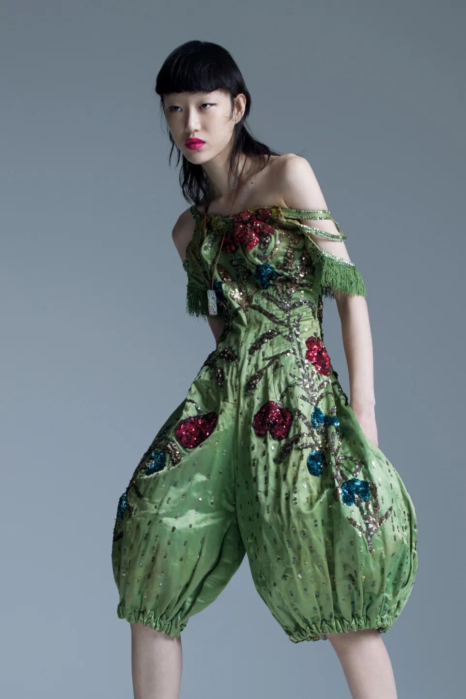 1920年代美国底特律Whitney Scenic & Costume Company出的刺绣公主缎小丑外套,这是一间专门做戏剧、舞台剧演出服的公司,可以想像当时的底特律有多繁荣。模特搭配1930年法国品牌不详的防水台超高跟鞋,脖子上的项链出自80年代,是扣住香槟口的那个小铁丝拆下来制成。