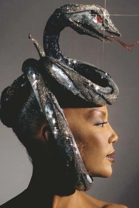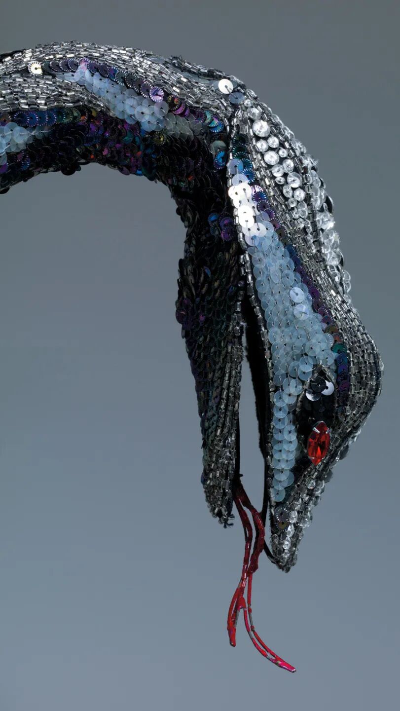 美国设计师Bob Mackie在1984年设计的手套,亮片犹如蛇的鳞片,又美又恐怖。他尤其擅长舞台造型,这个系列还有缠绕在头上的蛇形帽子。(右)