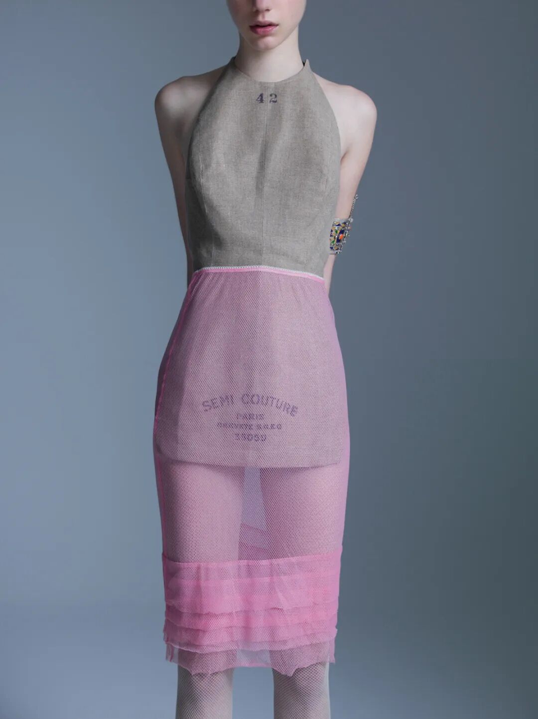 1997年秋冬的Maison Martin Margiela背心,搭配的粉色雪纺铅笔裙来自1994年的Helmut Lang。手臂上是阿尔吉尼亚北部1850年代的手镯。