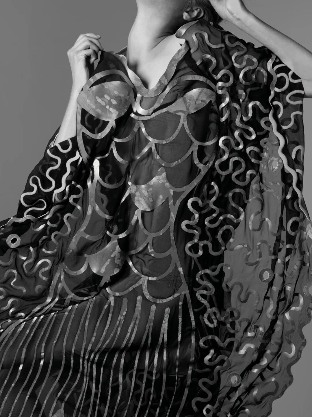 手绘的鱼纹蕾丝裙,腰下是人鱼裙摆,来自英国布料艺术家Carol Motty在1985年的创作。