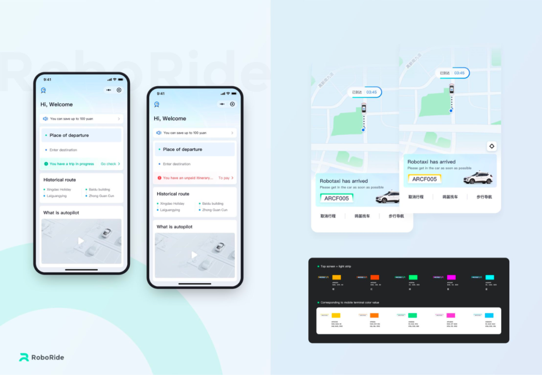 Roboride 是无人驾驶机器人出租车的完整解决方案。设计系统为用户和其他交通参与者创造了一种安全感。外屏作为用户的第一接触点,为身份认证提供了精准的交互方式。