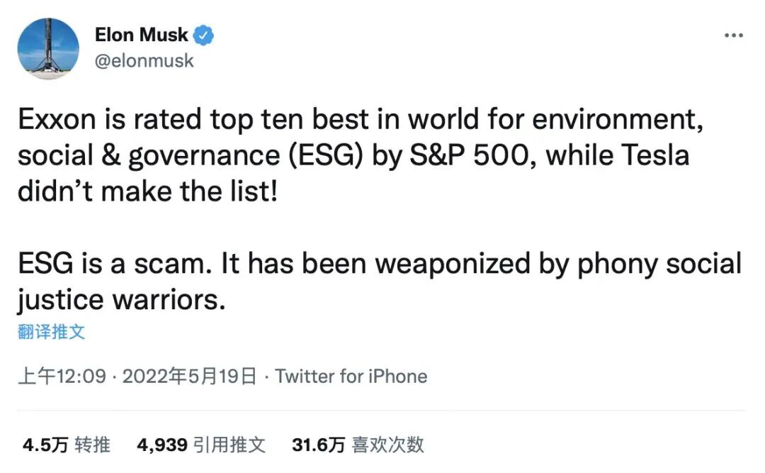 5月中旬更新的标普500 ESG指数中,特斯拉评分过低,于是马斯克在推特怒骂“ESG就是一个骗局。”