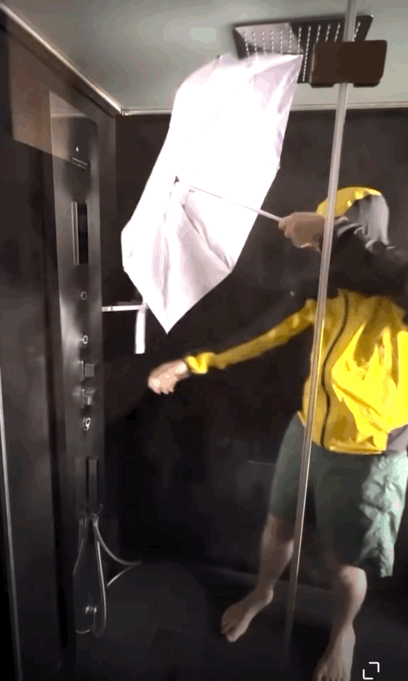 小哥全副武装鼓起勇气再战花洒,结果还是被喷得丢盔弃甲。