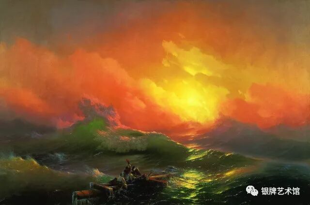 九级浪表现的是风暴中飘泊的人们,他们在帆船的残骸上,为了生存,拼命挣扎,狂风巨浪,呼啸而来。