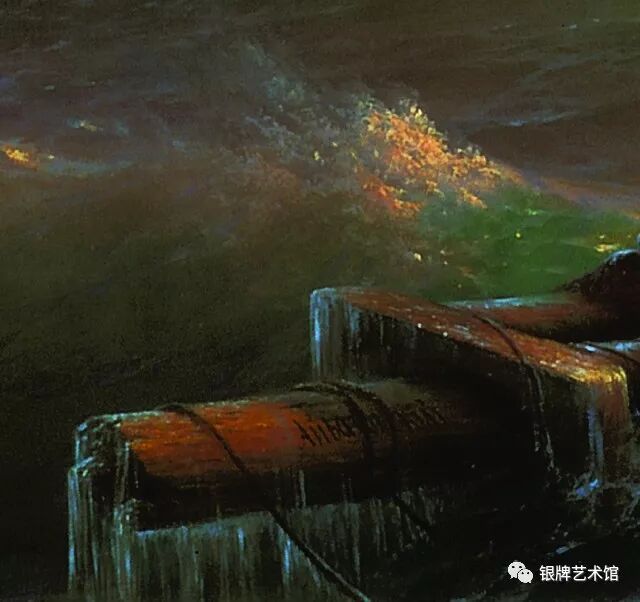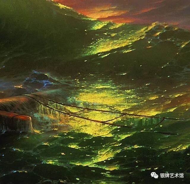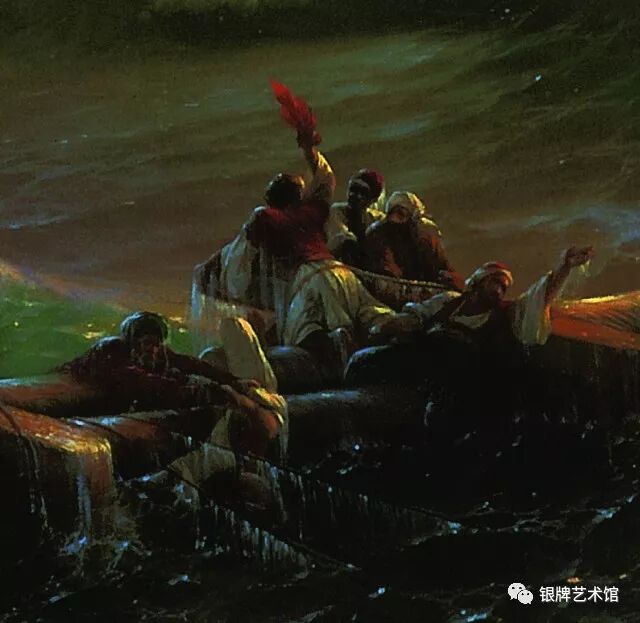 天空云雾浓重,透过云层的阳光洒在大海巨浪上,映照得灿烂透明,这给挣扎在死亡线上的人们以光明与信心。画家的笔触,完全融化在海浪中,给人身临其境之感。整个画面宏伟壮丽。