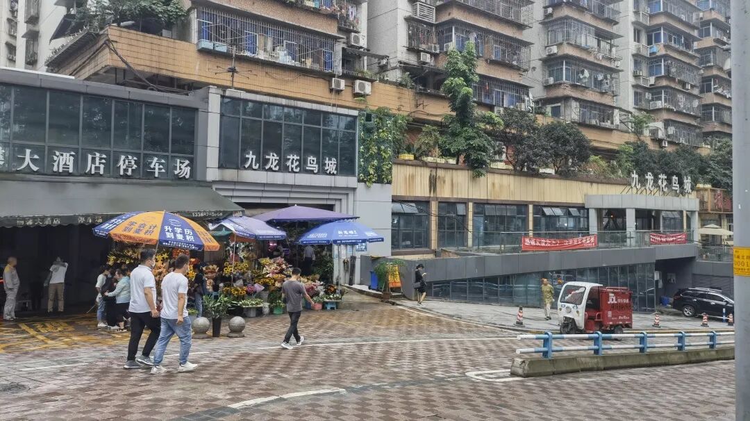 2020,疫情元年,虽然新冠对重庆的影响相对并不大,花市大约歇业了两三个月,就重新开门。但是困难是:鲜切花枯萎了就再进货,但是猫狗等宠物歇业这么久就都撑不住了。4月开门时,探访者发现花市与曾经相比空前寂静,昔日鹦鹉飞,猫狗叫的场面不再。政府因势利导,九龙花鸟城的地下三层就这么退出了花市版图。现在原本的地下三层变成了宠物用品、便利店、小卖部外向小店铺,服务于居民区的住户们,生意也算稳定,但是政府想要的以花市为主题的一体化商业街道确实难以实现了。