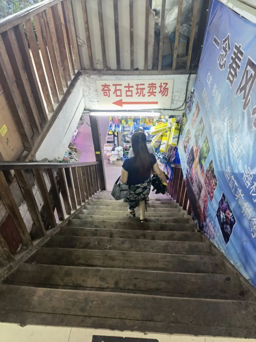 我在一层转了一圈,都没有找到电影中鱼缸的踪迹,直到我在一个角落的下行楼梯处看到了“奇石古玩卖场”的字样——