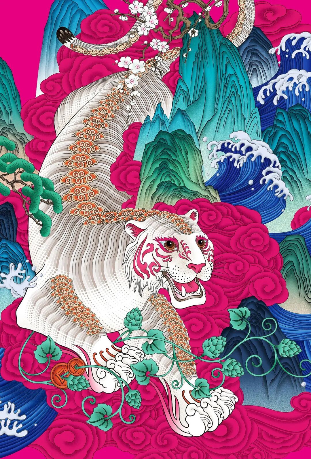 将祥云、海浪、山脉等元素与金虎、白虎相结合