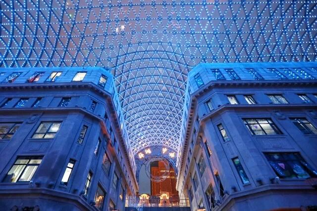 “外滩·中央”穹顶,是南京路步行街上一个全新的地标项目。四幢百年老大楼——中央大楼、美伦大楼、华侨大楼和新康大楼修旧如旧,楼与楼中间形成了一个“天然”的十字街区。