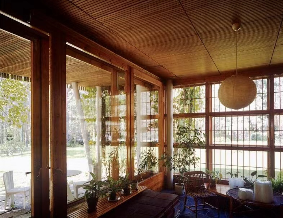 坐落在松林中的L型建筑体量展现了现代工业产物与自然环境的刚性对比,木材与混凝土材料的平衡、对森林垂直维度的提取、开敞庭院的过渡则像建筑拥入自然景观的双臂。这些试图从场地气候、自然条件以及传统习俗和都市文脉中去思考建筑的生存条件与设计原则,使建筑重新获得场所感与归属性。