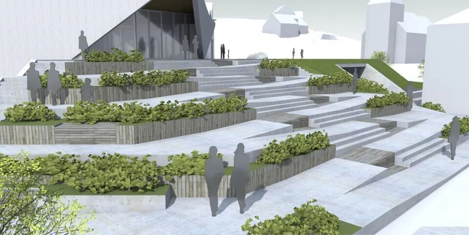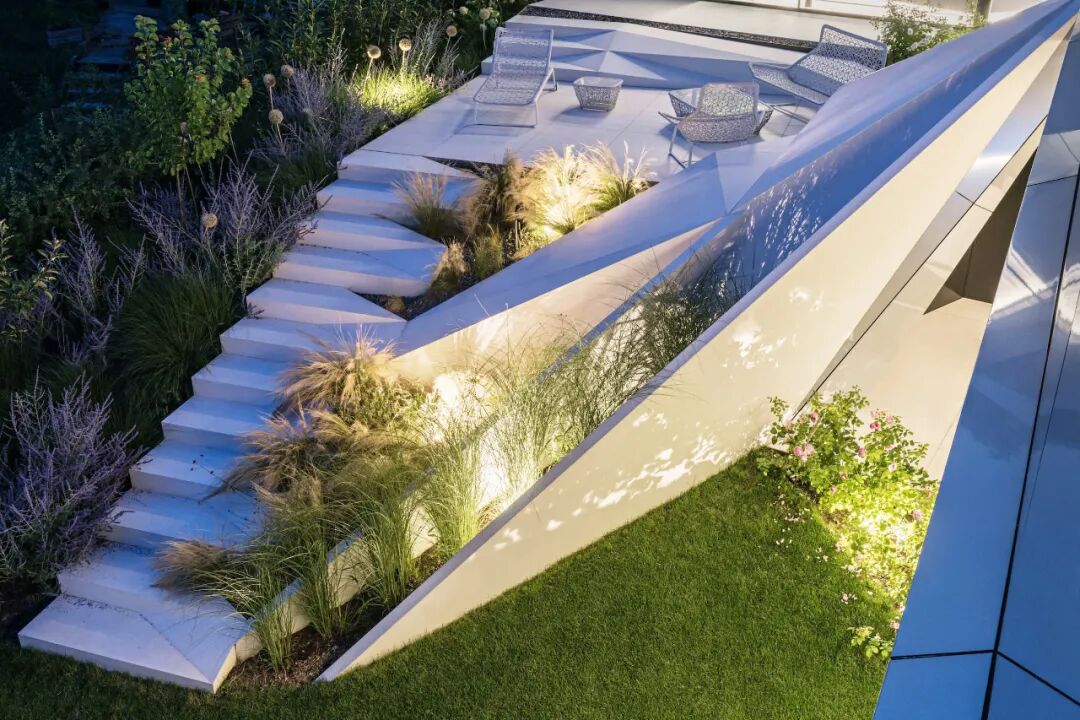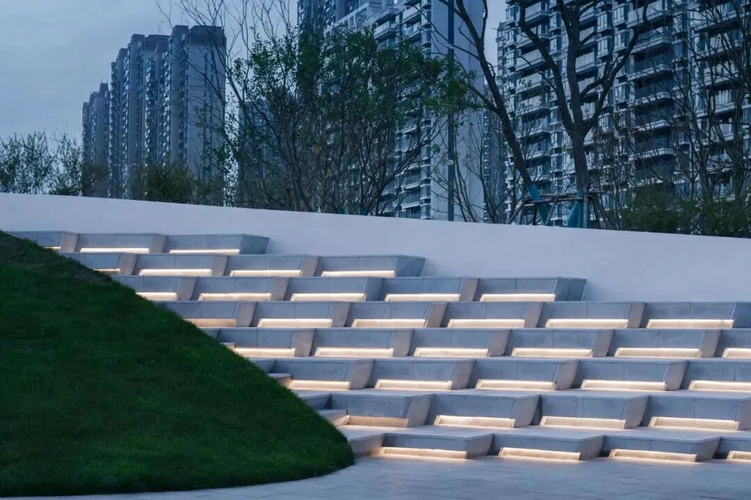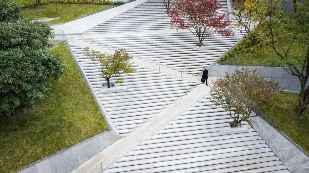 麓阶,一个湖畔的小型节点景观,也是整个麓湖皮划艇航道的起点——几块巨大的三角形阶梯,从市政道路依次错位拼接,最终连接湖岸的浅水平台,9米的场地高差排布出一种极简的户外空间美学。