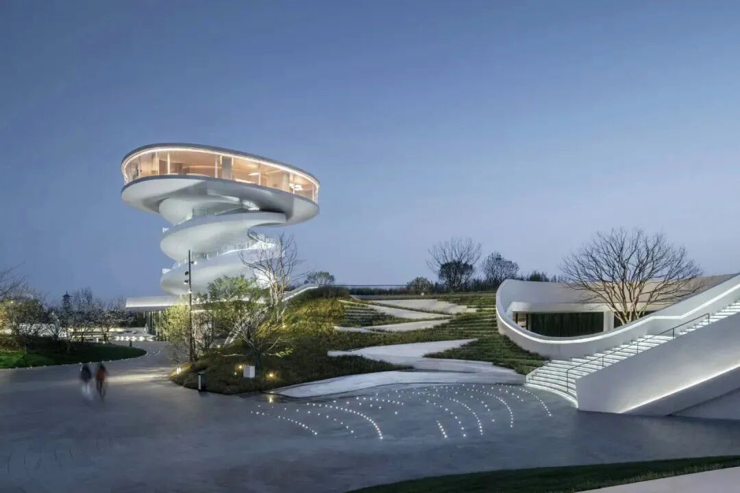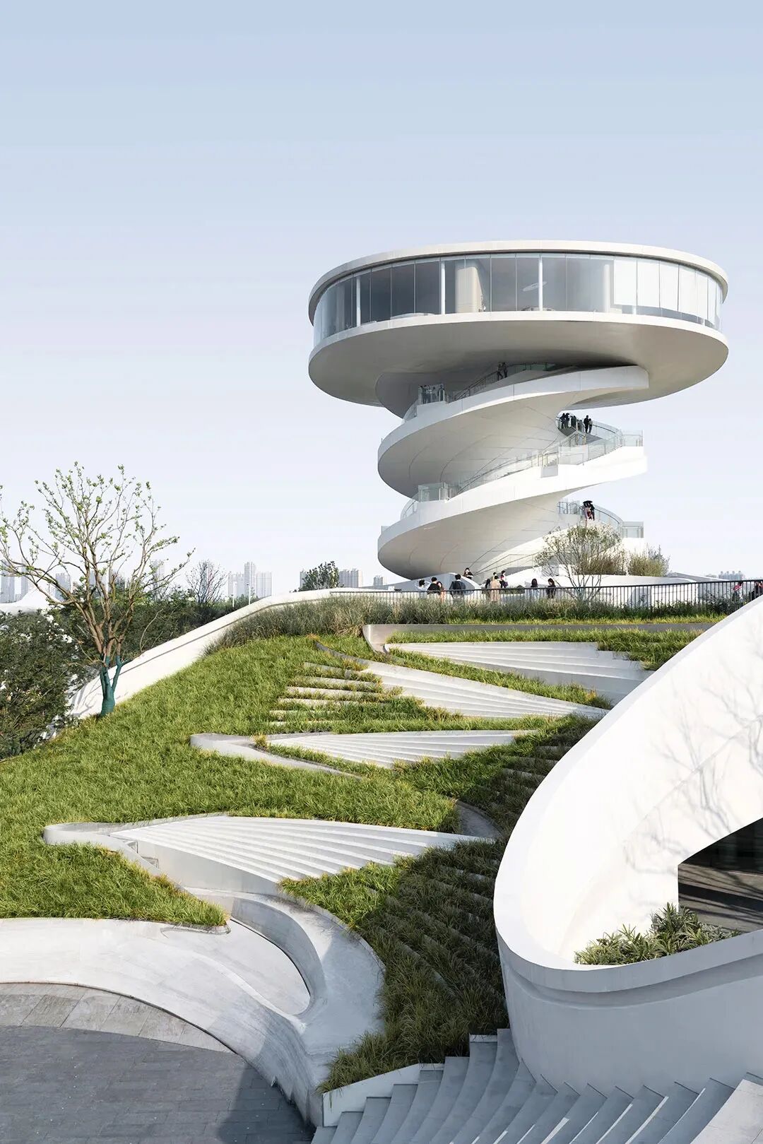 该项目设计理念是将湿地的自然品质融入到项目中,设计由水、地、天三个自然元素组成,对应前广场、商业设施、观景塔三个功能区。每个景观节点都为不同年龄层的人提供了有趣而难忘的空间体验。