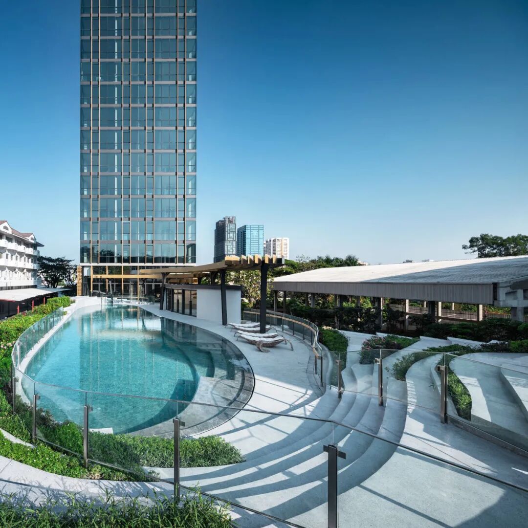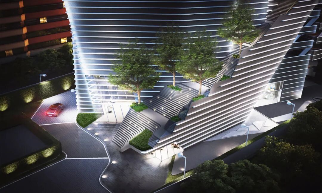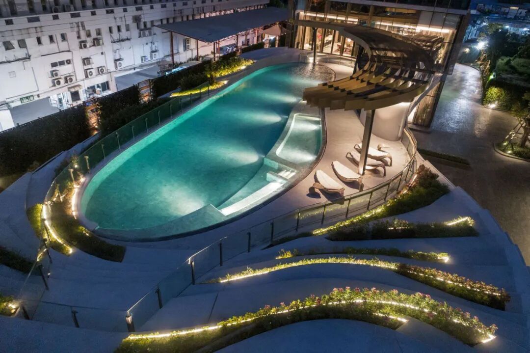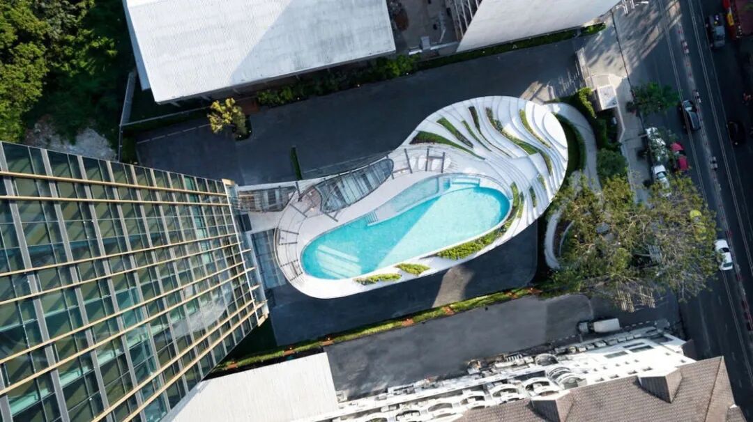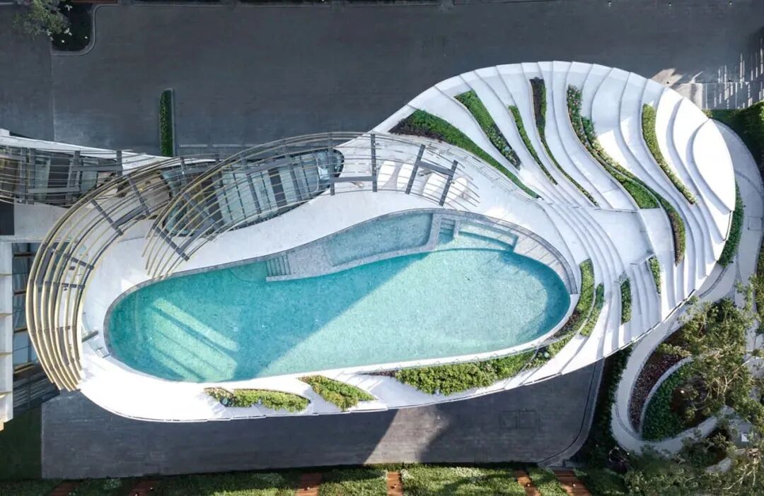 诺亚方舟般的巨型泳池为整个项目亮点,像一块绿色的宝石嵌入社区内部,而泳池旁边的台阶设计也是高颜值的存在。