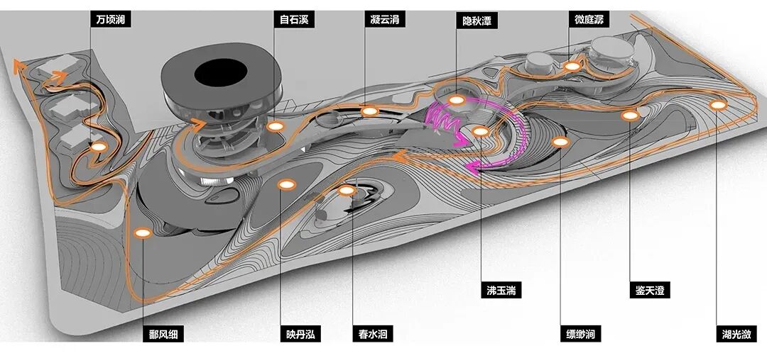 设计师以南宋马远《十二水图》成画,构建水之十二表情:湖光潋、鉴天澄、缥缈涧、沸玉湍、春水洄、映丹泓、鄱风细、万顷澜、自石溪、凝云涓、隐秋潭、微庭潺。