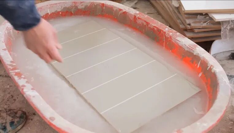 将存在色差、裂纹、破损、缺角等瑕疵瓷砖挑出,再将品质完好的瓷砖完全浸入水中,浸泡半个小时以上。