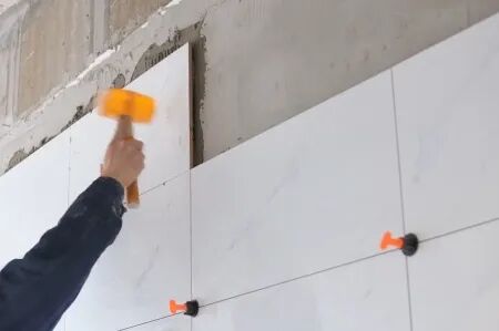 在铺贴时,要用橡皮锤充分均匀的敲打瓷砖表面,保证平整压实。实心墙面可以通过五点敲击法来检查瓷砖是否有空鼓现象,若粘贴不实,需揭下来重贴。