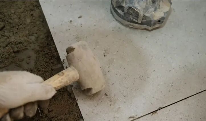 使用水泥砂浆,在瓷砖背面铺平、抹匀,从门口开始纵向铺设1~2行砖,以此为基准拉纵横水平标高线。放上瓷砖试铺,用橡皮锤敲打至水平标高线。