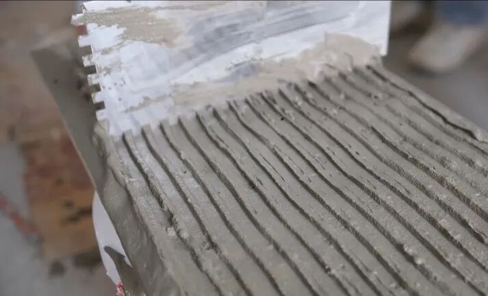 将搅拌均匀的瓷砖粘结剂,用齿型抹刀的直面,用力均匀批刮至墙面基层上。再用齿刀的齿面批刮纹路,使其均匀饱满。
