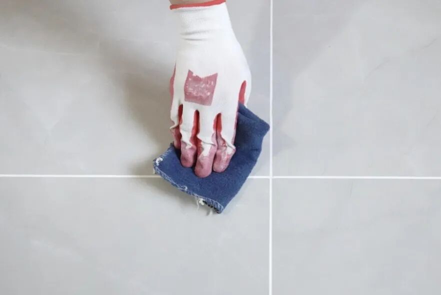铺贴完成48小时后,可进行瓷砖勾缝,用橡胶挂板将调好的勾缝剂均匀饱满地刮在砖缝位置。处理完成后,清洁瓷砖表面多余的勾缝剂及其他污渍,后期需对墙面进行养护。