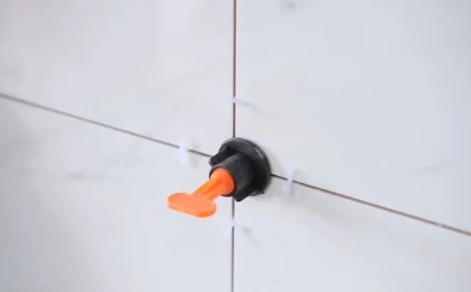 用十字卡控制砖缝宽度,并用瓷砖调平器对瓷砖的平整性进行校核调整。