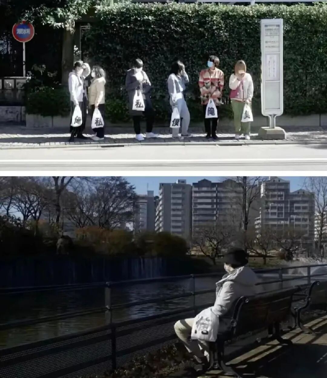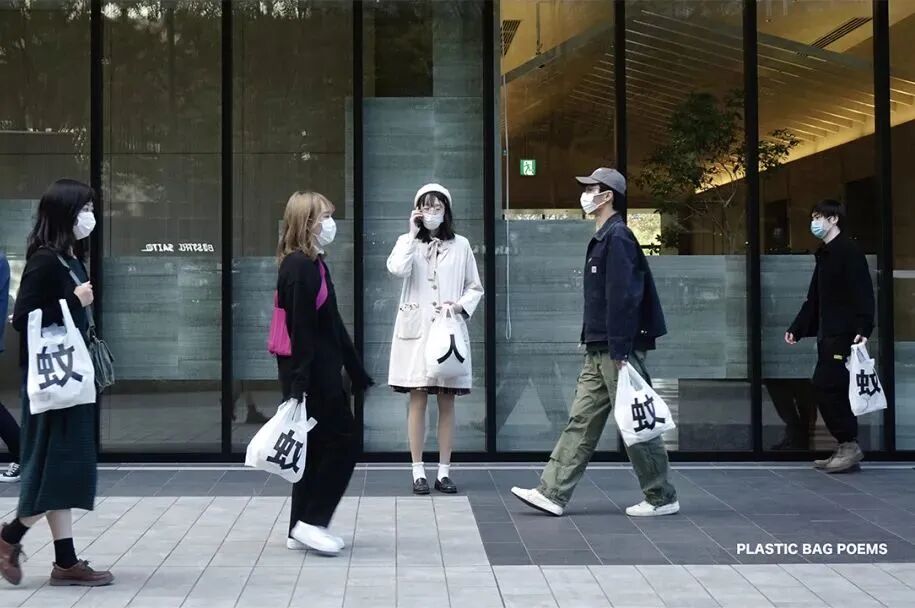 形形色色的人背着塑料购物袋在城市里来回穿梭,看到这个景象的我决定在塑料购物袋上印上粗大的汉字,比如“蚊子”、“人”、“丈夫”、“妻子”等。于是,随处可见的塑料购物袋在城市中营造出奇异的景象,人们在不可控的情况下无意识地传递着某种信息。