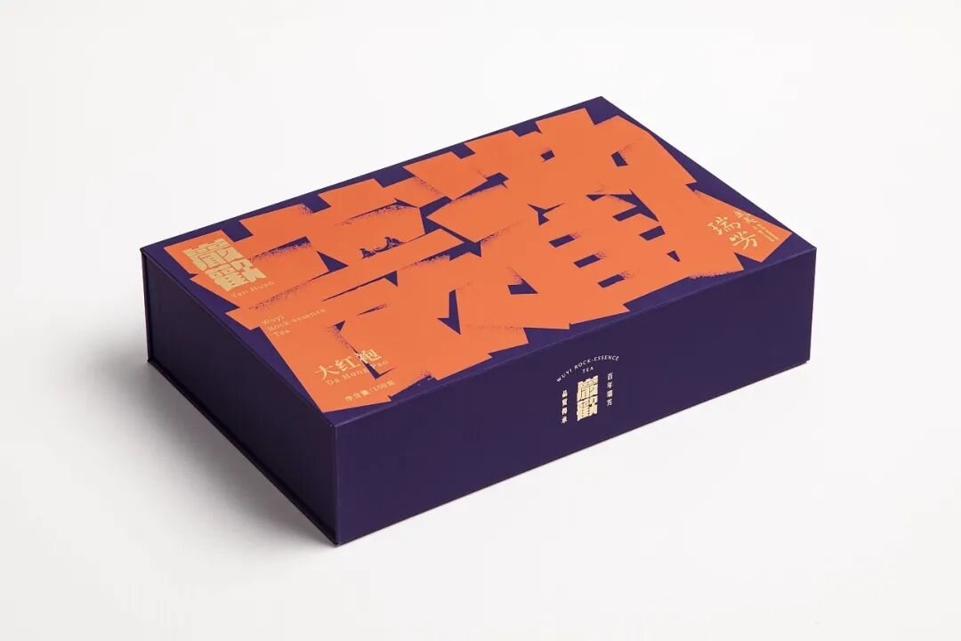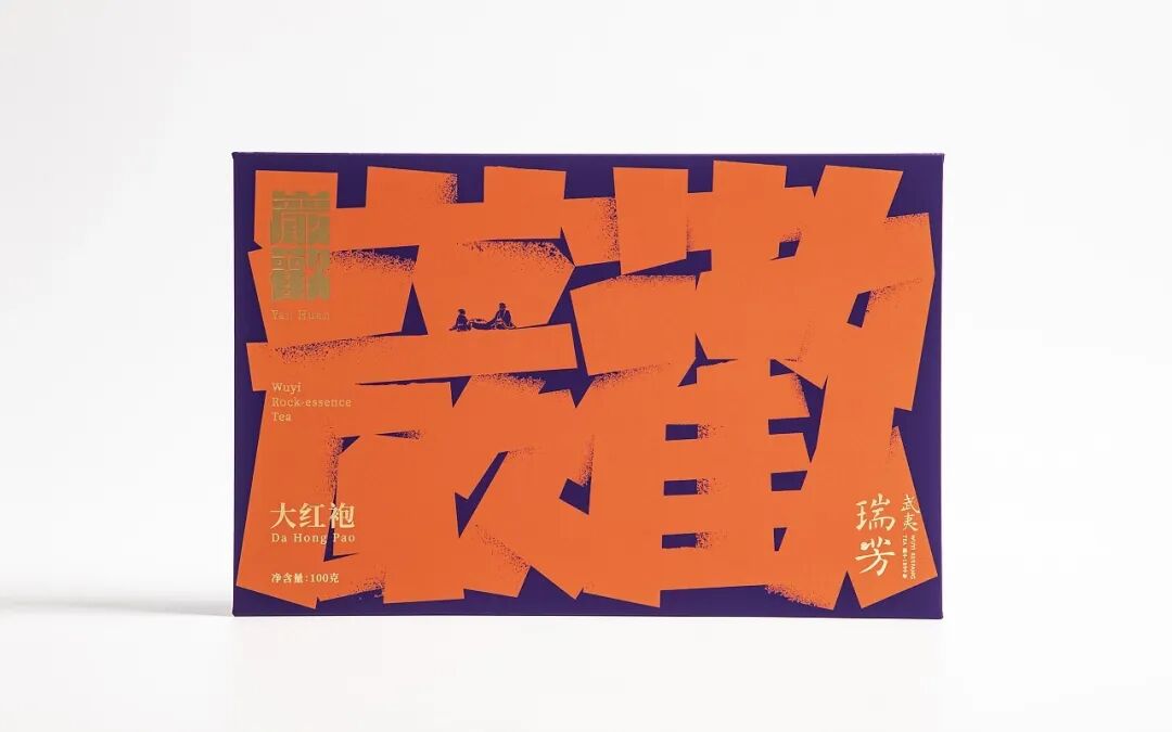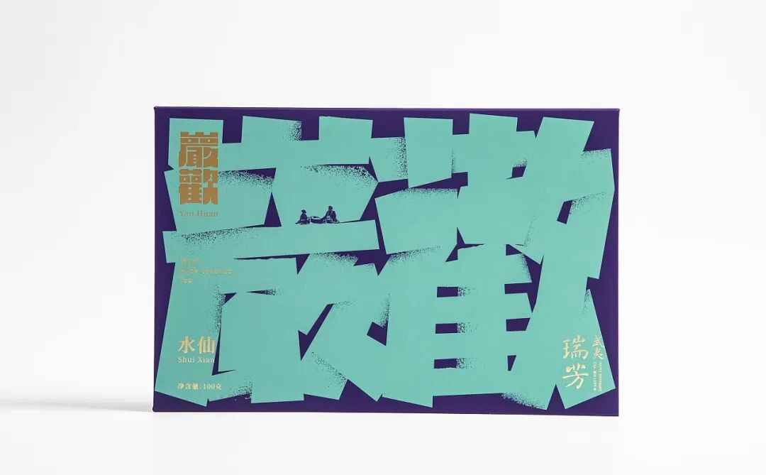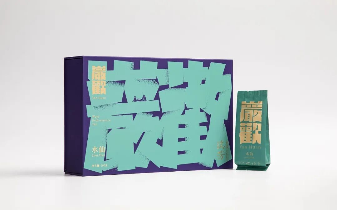 岩欢二字,由民国时期广告字体变化而来,融入岩石的堆砌感与颗粒感,体现出武夷山层峦叠嶂的环境之美及岩茶蕴含的力量感。