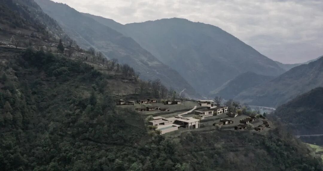 既下山·九寨选址在九寨黄龙机场所在的松潘县川主寺镇,占据一个独立山谷,对面是雪宝顶的第二高峰。