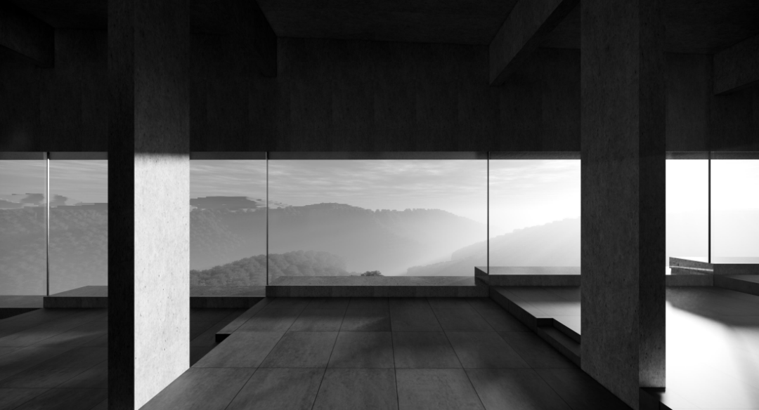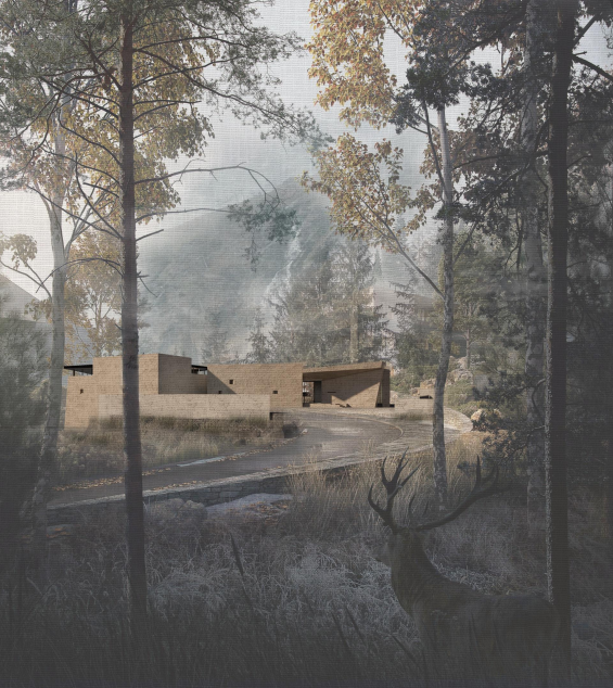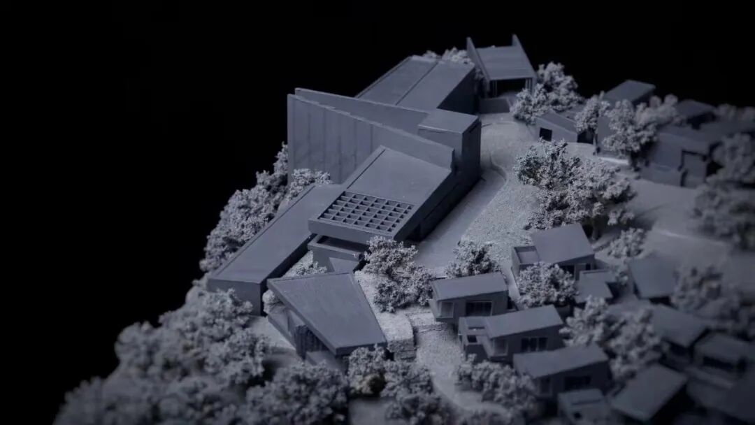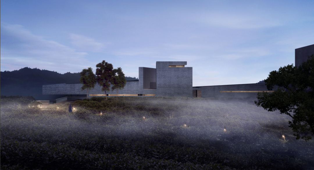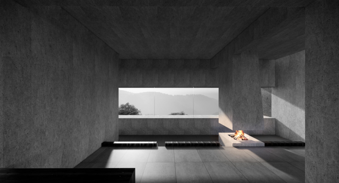 酒店踞于崖顶,空间自上而下延展,就像理想中旅人的探访:从山顶开始,沿着脊线而下,穿越保护区域中的茶田、古树和石径……到达开阔的平地,转身就进入空间节制而放松的大堂,房间中间一处壁炉如同山石中窜出地火,而山景通过狭长的开窗透入室内。