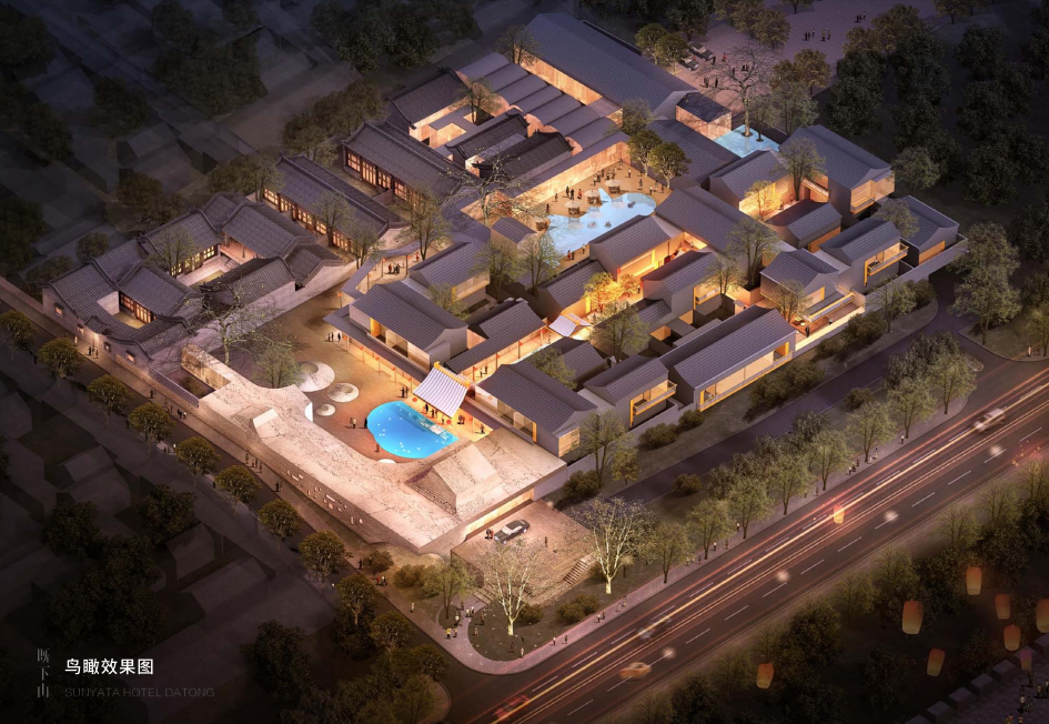既下山·大同在大同古城东南隅,与代王府隔路相望。大同的历史遗存古建,多是格局恢弘、工艺细腻,而古城有古建保护规制的限制,所以酒店改建起来,也需要一定的功力。
