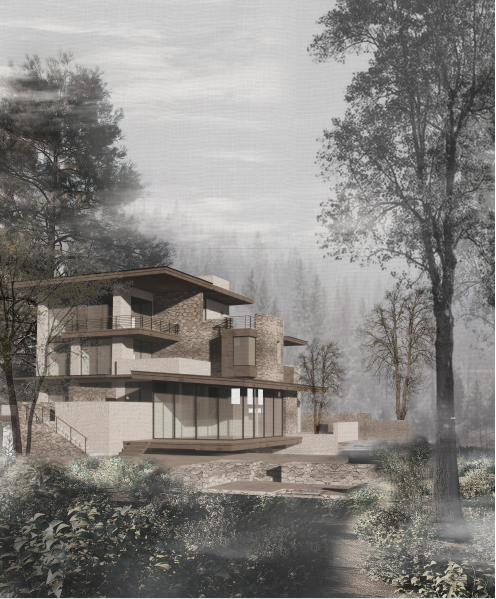 酒店的主楼区、别墅群散布于整座山谷间,映入眼帘的是一幢幢平顶建筑,以山石砌墙,山木搭架,消隐于山林。既下山和九寨,仿佛组成了一个浑然天成的共生空间。