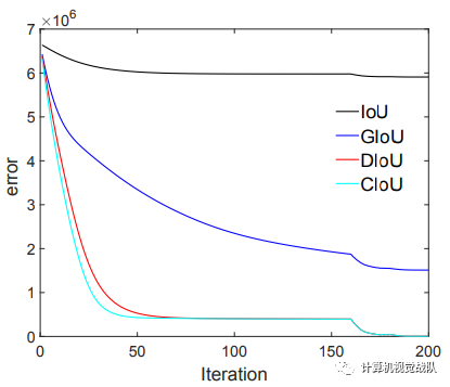 GIoU:从GIoU误差的曲线我们可以发现,对于一些没有重叠的anchor,GIoU的表现要比IoU更好。但是由于GIoU仍然严重的依赖IoU,因此在两个垂直方向,误差很大,基本很难收敛,这就是GIoU不稳定的原因;
