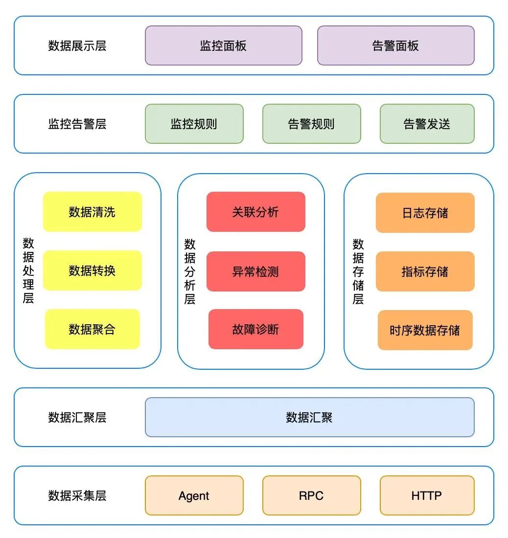 从下往上来分析,首先是数据采集层,提供众多采集手段,包括Agent采集、RPC埋点、HTTP上报等,可以通过Agent采集宿主机监控数据和日志,或者RPC埋点上报,也可以由用户直接通过HTTP推送进行数据采集。